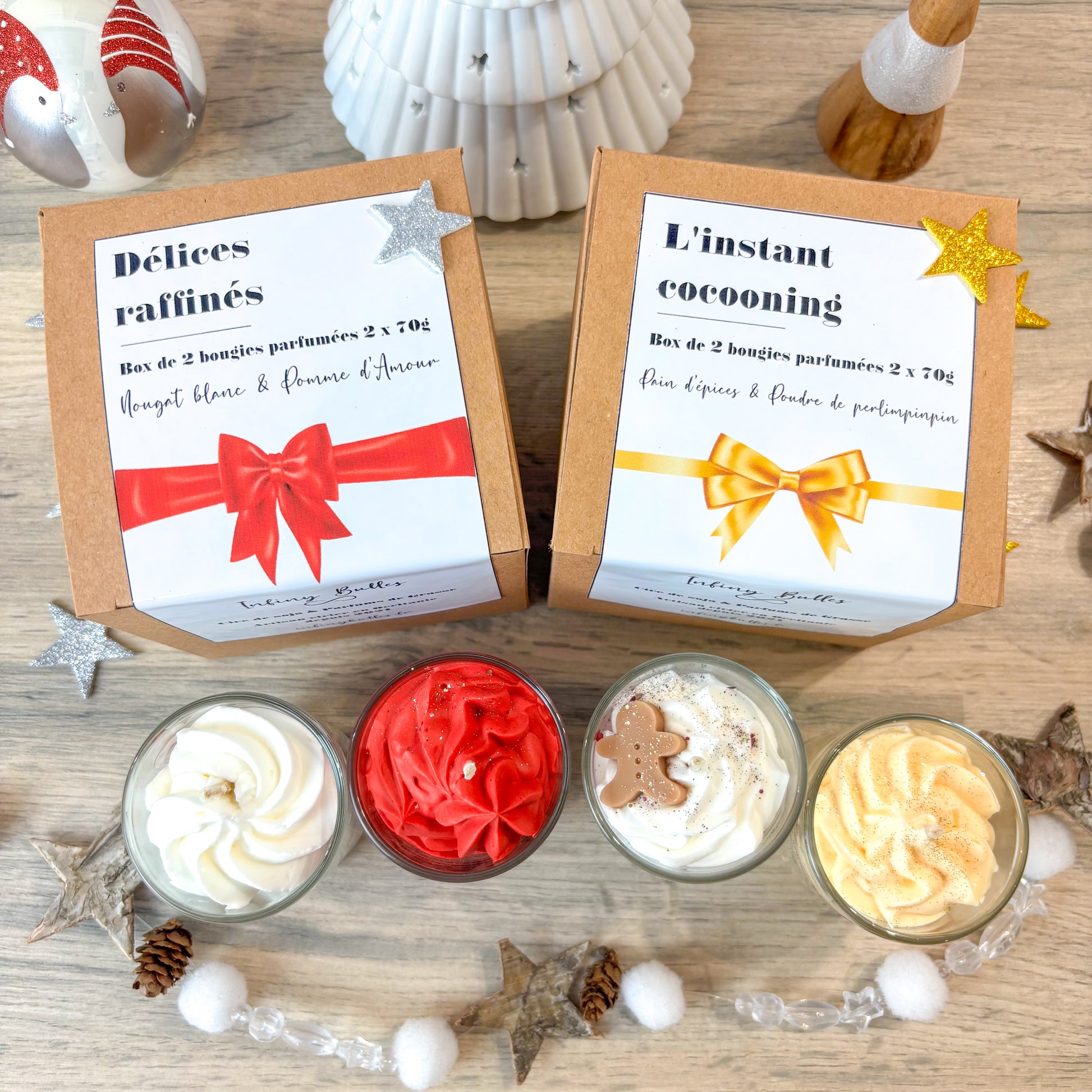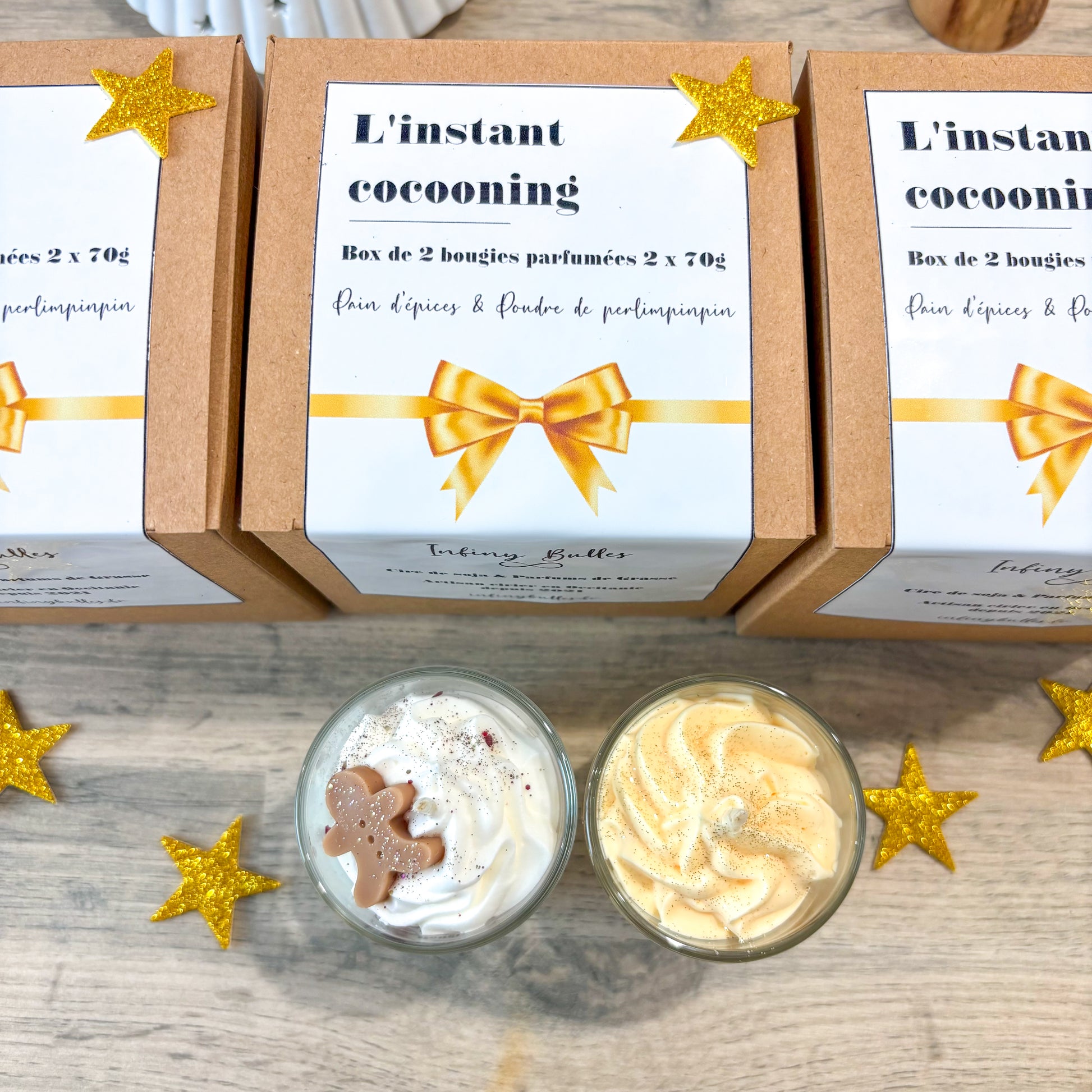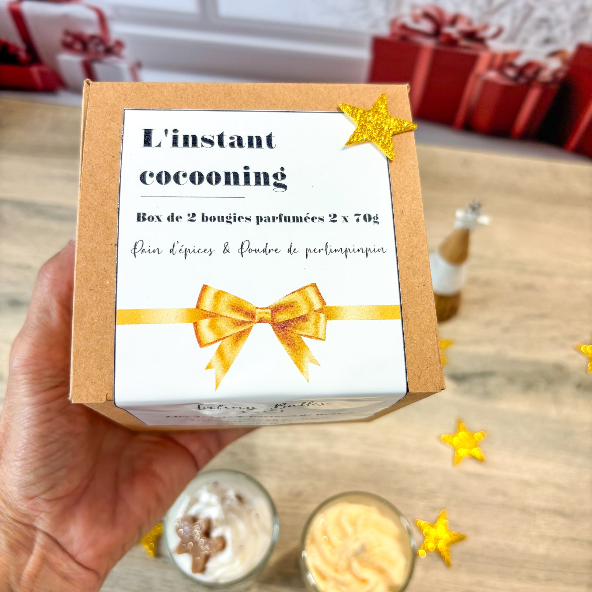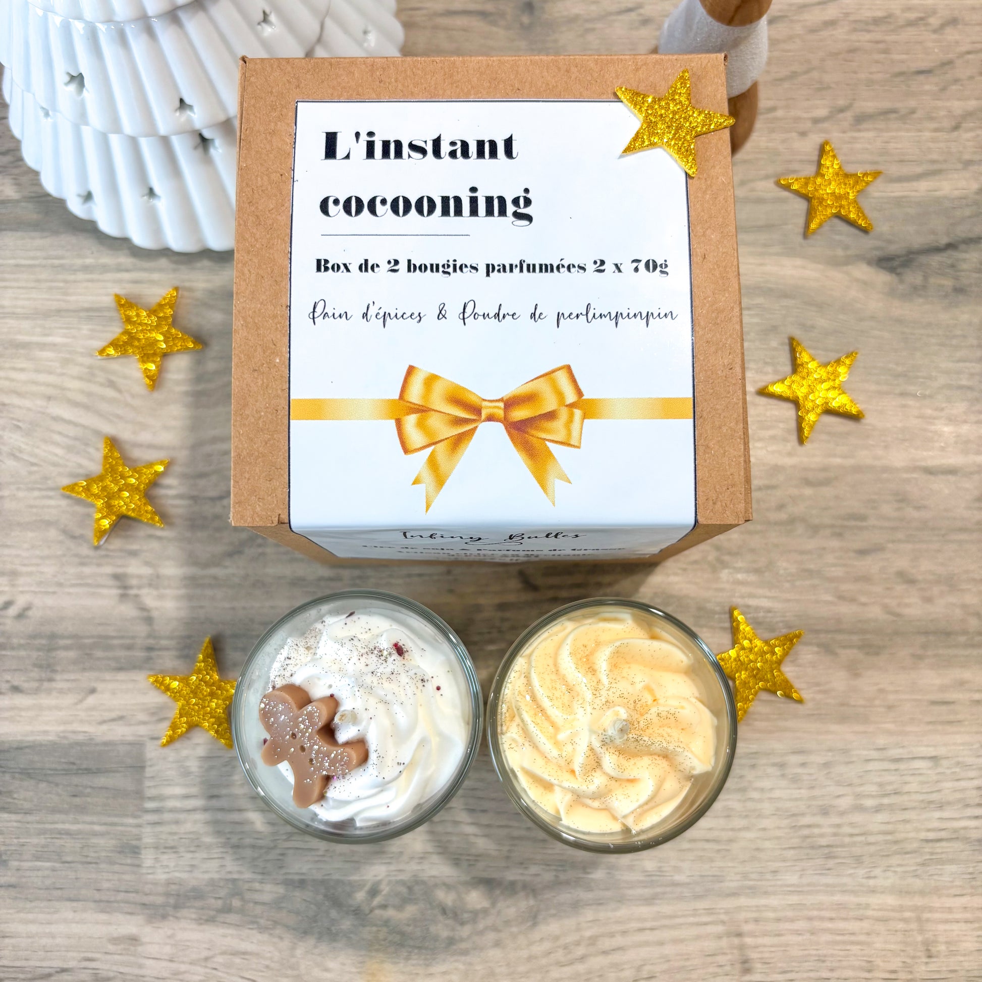 La box contient: 1 bougie de 70g au parfum pain d'épices et 1 bougie de 70g au parfum Poudre de Perlimpinpin