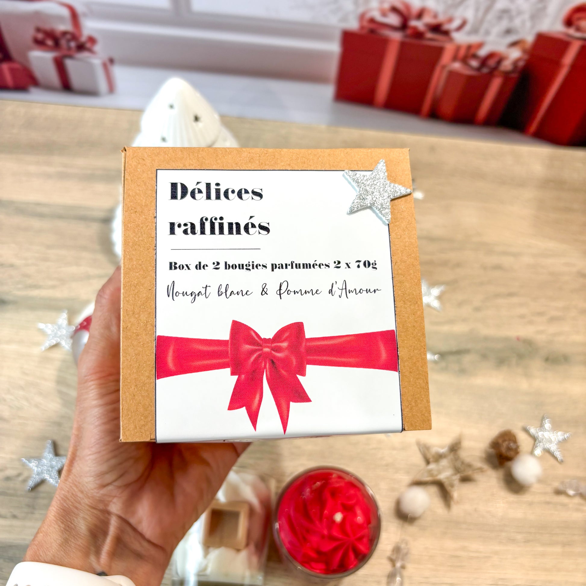 La box contient: 1 bougie de 70g au parfum nougat blanc et 1 bougie de 70g au parfum Pomme d'amour