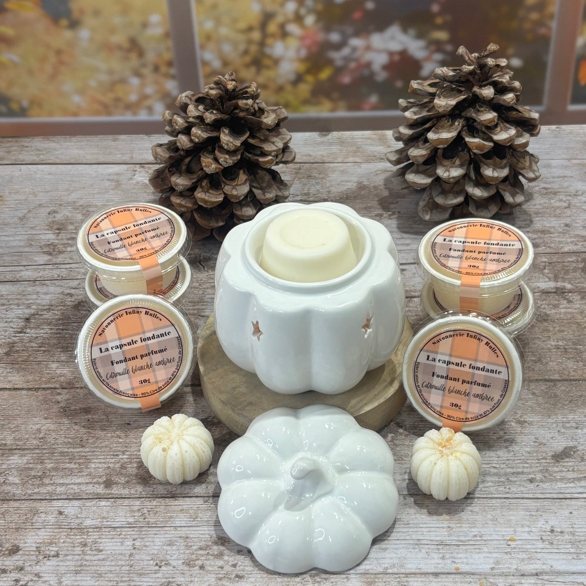 À avoir absolument chez soi pour l’automne , effet 2 en 1 car il décore et parfume délicatement l’intérieur grâce aux fondants , en plus il existe le fondant citrouille assorti, foncez c’est une tuerie!